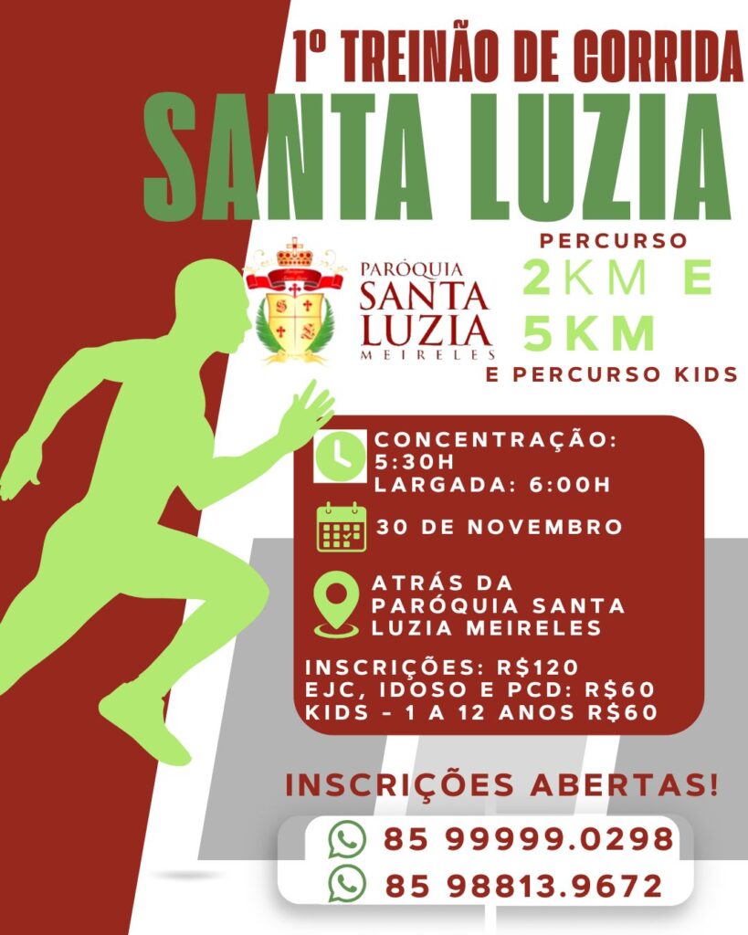 Esse ano nossa paróquia trás uma proposta diferente, promovendo um treino de corrida como parte das comemorações do festejo de Santa Luzia 2025. O evento tem como objetivo animar paroquianos e devotos de Santa Luzia fortalecer laços, a estarem juntos mais um ano agradecendo a tão especial intercessão de nossa padroeira, como também incentivando o […]