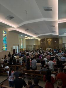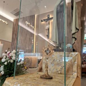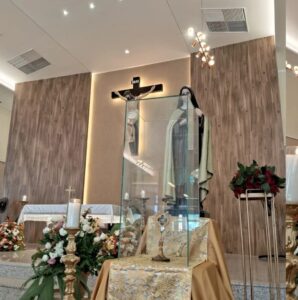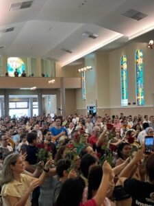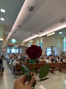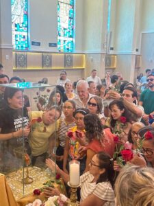 Cada fiel com sua rosa e alegria em ver tão perto a relíquia de uma Santa que prometeu cuidar dos que recorrem a sua intercessão na terra.